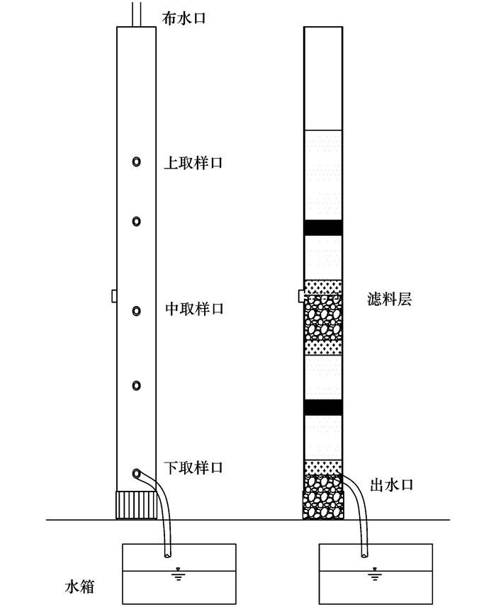 生態高負荷土地快速滲濾系統如圖 1所示, 該系統為兩級串聯, 主體反應器由PVC圓柱制成; 濾床總高度為165 cm, 有效直徑為15 cm, 上方有30 cm的進水空間, 下方有出水口用于收集處理后的廢水; 填料從上至下分別為砂子、碳粉、碎石等, 填料層的有效高度為130 cm.豬場廢水由反應器頂部噴灑至濾料表面, 底部出水.采用自然通風, 且在濾床的側壁上的不同高度設有取樣口.