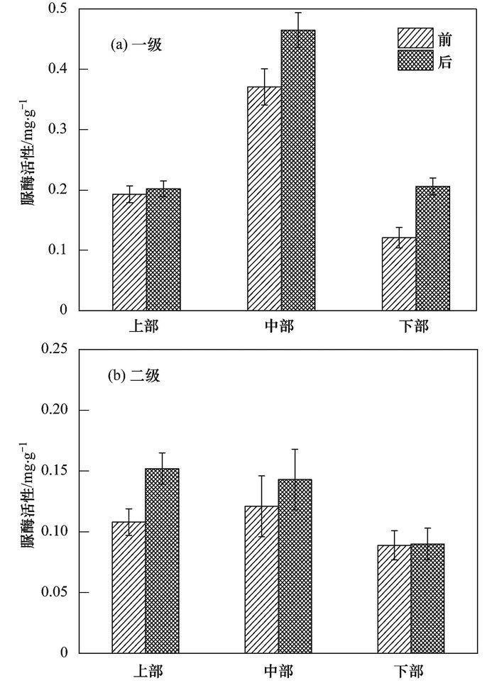 脲酶是一種作用于線性酰胺的C—N鍵的水解酶, 它能夠催化酰胺化合物轉變為氨, 在有機氮的降解過程中發揮著重要作用.黃映恩等人研究表明脲酶活性越大, 土地滲濾系統對總氮的去除率越高, 在土地滲濾系統脫氮過程中, 脲酶發揮了重要作用, 它能促進有機氮向無機氮的轉化, 使系統脫氮能力增強.由圖 8可知, 經過處理豬場廢水后, 一級土地滲濾系統上、中、下部的脲酶含量分別是0.202、0.465、0.206 mg·g-1, 與處理前相比, 脲酶含量均有一定程度的提升, 并且可知對于廢水中有機氮的轉換主要發生在滲濾系統的中部, 原因在于氨化細菌相對于降解有機物的異養菌而言, 其生長較為緩慢.同時由圖 8可知, 經過處理豬場廢水后, 二級土地滲濾系統上、中、下部的脲酶含量分別是0.152、0.143、0.090 mg·g-1, 表明該系統對于有機氮的轉換也發揮了一定的作用.