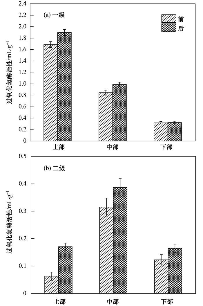 過氧化氫酶是參與土地中物質和能量轉化的一種重要氧化還原酶, 在一定程度上可以表征土地生物氧化過程的強弱; 更為重要的是可以表征活性微生物量及其對有機物的降解活性.由圖 7可知, 在進豬場廢水前, 一級土地快速滲濾系統上、中、下部的過氧化氫酶含量分別是1.687、0.845、0.318 mL·g-1, 經過處理豬場廢水后, 上、中、下部的過氧化氫酶含量分別是1.899、0.990、0.323 mL·g-1, 表明該系統對有機物的去除具有良好的效果, 這與圖 2結果也是一致的; 并且可以看出, 有機物的去除主要發生在一級土地快速滲濾系統的上部與中部.同時由圖 7可知, 二級土地快速滲濾系統處理豬場廢水后, 上、中、下部的過氧化氫酶含量分別是0.171、0.387、0.165 mL·g-1, 與一級土地快速滲濾系統相比, 其含量有了很大程度的減少, 表明二級土地快速滲濾系統對于有機物的去除更多的是一個保障與深度處理的作用, 且更多的是去除一些豬場廢水中難于生物降解的有機污染物.