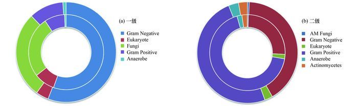 由圖 10可知, 一級土地快速滲濾系統上部與下部Gram Negative(革蘭氏陰性菌)、Eukaryote(真核生物)、Fungi(真菌)、Gram Positive(革蘭氏陽性菌)、Anaerobe(厭氧菌)所占比例分別為:55.45%與55.87%、8.92%與4.09%、26.24%與27.88%、8.72%與11.11%、0.67%與1.05%, 表明上部與下部的Gram Negative變化并不是非常明顯, 周莉娜等的研究表明高濃度氨氮會使Gram Positive含量下降, 因此該系統上部Gram Positive低于下部; 同時由于上部溶解氧含量較高, 因此上部的Anaerobe含量低于下部.同時由圖 9可知, 二級土地快速滲濾系統上部與下部AM Fungi(叢枝菌真菌)、Gram Negative、Eukaryote、Gram Positive、Anaerobe、Actinomycetes(放線菌)所占比例分別為:0.49%與0.58%、25.25%與41.2%、1.93%與2.58%、67.90%與49.54%、2.13%與3.24%、2.30%與2.86%, Gram Positive的含量發生了明顯的變化, 降低了18.36%, 主要原因在于亞硝氮和硝氮使Gram Positive的含量下降, 可能是由于亞硝氮和硝氮對某些微生物具有直接的毒性作用, 從而導致這部分微生物直接死亡; 在二級土地快速滲濾系統中AM Fungi與Actinomycetes占有一定的比例, 這類微生物可促進難降解的有機物的降解, 可以對整個土地快速滲濾系統的處理效能起到保障的作用.具體參見污水寶商城資料或http://www.bnynw.com更多相關技術文檔。
