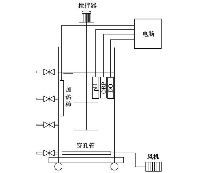 試驗(yàn)采用SBR反應(yīng)器, 如圖 1所示, 由有機(jī)玻璃制成, 內(nèi)徑300 mm, 高1 400 mm, 總?cè)莘e為100 L, 有效容積為90 L.曝氣器采用穿孔管, 激光開孔孔徑為0.1 mm, 孔間隔為10 mm, 曝氣量通過(guò)轉(zhuǎn)子流量計(jì)控制.試驗(yàn)溫度通過(guò)恒溫加熱棒控制.反應(yīng)器內(nèi)設(shè)有傳感器, 用以監(jiān)測(cè)工藝運(yùn)行工程中的pH、DO、ORP和溫度(T).