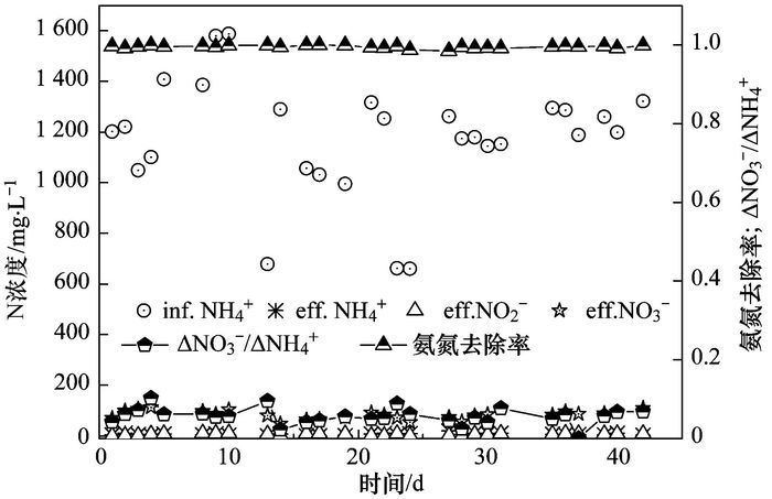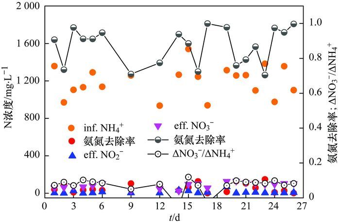 反應(yīng)器在穩(wěn)定運(yùn)行期間, 曝氣量平均維持在220 L·h-1, DO平均維持在0.12mg·L-1; 進(jìn)水氨氮濃度波動(dòng)較大, 為917~1 540 mg·L-1, 平均為1 188 mg·L-1; 出水氨氮濃度不穩(wěn)定, 最高濃度為148mg·L-1, 最低濃度為0.23mg·L-1, 出水氨氮濃度平均為56 mg·L-1; 氨氮去除率范圍較大, 為70%~99%, 平均值為87%;出水亞硝態(tài)氮濃度平均為10.7 mg·L-1; 出水硝態(tài)氮濃度平均為84 mg·L-1; 硝態(tài)氮的生產(chǎn)量/氨氮的消耗量比例平均為0.08, 小于CANON工藝的理論值0.11, 說(shuō)明系統(tǒng)內(nèi)同時(shí)存在反硝化作用.反應(yīng)初始C/N比為0.2, 說(shuō)明系統(tǒng)內(nèi)主要進(jìn)行的是自養(yǎng)脫氮過(guò)程, ANAMMOX菌具有較好的脫氮效果.