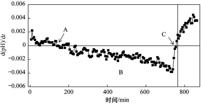 由圖 5可以看出, 忽略系統(tǒng)誤差, pH的一階導(dǎo)數(shù)曲線在周期內(nèi)出現(xiàn)了3個(gè)特征點(diǎn):由正值變負(fù)值點(diǎn)(A)、連續(xù)為負(fù)值點(diǎn)(B)和由負(fù)值轉(zhuǎn)為正值點(diǎn)(C).這3個(gè)點(diǎn)分別對(duì)應(yīng)有機(jī)物降解階段、CANON反應(yīng)階段和氨氮降解完全CANON工藝反應(yīng)結(jié)束階段.在反應(yīng)周期內(nèi), 若pH的一階導(dǎo)數(shù)曲線連續(xù)大于零, 則預(yù)示著CANON反應(yīng)的結(jié)束.