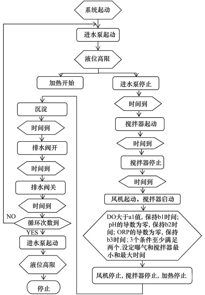 由以上分析可知, 可以采用pH的一階導(dǎo)數(shù)、DO突躍點(diǎn)和ORP的一階導(dǎo)數(shù)作為指示CANON工藝反應(yīng)結(jié)束的控制參數(shù).因有機(jī)物去除階段與反應(yīng)結(jié)束時(shí), pH和ORP的一階導(dǎo)數(shù)規(guī)律相似, 且反應(yīng)過(guò)程中先進(jìn)行有機(jī)物的去除, 為避免反應(yīng)階段的混淆, 通過(guò)設(shè)置工藝最低反應(yīng)時(shí)間的方式進(jìn)行區(qū)分.高大文等在溫度為29℃±1℃, 曝氣量為0.6 m3·h-1, 進(jìn)水COD為650~660 mg·L-1的條件下, 運(yùn)行了120 min后, 達(dá)到了COD難降解的程度.本試驗(yàn)中溫度為30℃±1℃, 曝氣量為0.2 m3·h-1, 進(jìn)水COD濃度為196~400 mg·L-1, 保守選取工藝最低反應(yīng)時(shí)間為200 min.為減小pH、DO和ORP的檢測(cè)誤差, 對(duì)控制參數(shù)達(dá)到特征點(diǎn)后進(jìn)行延時(shí), 并設(shè)定至少滿足兩個(gè)參數(shù)點(diǎn)時(shí), 曝氣階段才可以結(jié)束, CANON工藝的具體實(shí)時(shí)控制策略如圖 8所示.
