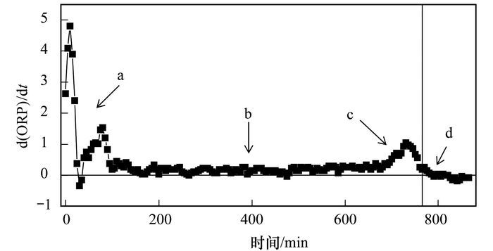 由圖 7可以看出, ORP的一階導(dǎo)數(shù)曲線在周期內(nèi)出現(xiàn)了4個(gè)特征點(diǎn):第一凸點(diǎn)(a)、連續(xù)為正值點(diǎn)(b)、第二凸點(diǎn)(c)和正值變負(fù)值點(diǎn)(d).這4個(gè)點(diǎn)分別對(duì)應(yīng)有機(jī)物降解階段、CANON反應(yīng)階段、氨氮基本被去除和氨氮被完全去除階段.忽略系統(tǒng)誤差, ORP的一階導(dǎo)數(shù)曲線出現(xiàn)一次導(dǎo)數(shù)為零的情況, 當(dāng)導(dǎo)數(shù)為零時(shí), 預(yù)示系統(tǒng)內(nèi)氨氮已經(jīng)被完全去除.