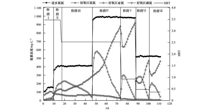 中試連續運行過程中氮素的轉化情況如圖 2所示, 運行參數如圖 3(a)所示, 氮素負荷變化如圖 3(b)所示.啟動階段(階段Ⅰ)反應器進水NH4+-N濃度為150 mg·L-1, 進水氮負荷為(0.04±0.005) kg·(m3·d)-1, 出水NH4+-N濃度為20 mg·L-1, NO2--N濃度僅有不到10 mg·L-1, NO3--N濃度很高, 超過了100 mg·L-1, 反應器初始階段基本沒有NO2--N積累(NAR)的現象, NH4+-N去除率達到92.2%.隨即(階段Ⅱ)將進水NH4+-N濃度調整至(400±10) mg·L-1, 此時的進水氮負荷達到0.120 kg·(m3·d)-1, 出水NH4+-N和NO2--N濃度有所提升, NO3--N濃度雖較階段Ⅰ稍有下降, 但濃度依然很高, 開始出現NO2--N的累積, NAR為62%, NH4+-N去除率達到51%.反應運行至階段Ⅲ時, 增加進水流量的方式提高進水負荷, 此時進水氮負荷為0.160 kg·(m3·d)-1, NO2--N產生速率(NPR)從0.05 kg·(m3·d)-1增加至0.12 kg·(m3·d)-1, NAR也增加至80%, NH4+-N去除率達到90.8%.為了獲得更高的NAR和NPR, 將進水NH4+-N濃度提高至(990±10) mg·L-1(階段Ⅳ), 此時的進水氮負荷達到0.39 kg·(m3·d)-1, 隨著反應的運行, 反應器中的NO2--N濃度逐漸增加, NH4+-N和NO3--N濃度逐漸降低, 運行至73 d時, 反應器中的NAR達到97%, NH4+-N去除率達到96.4%, 此時的NPR為0.36 kg·(m3·d)-1.在階段Ⅴ的運行中, 通過增加進水流量的方式將HRT由2.53 d縮短為0.93 d, 此時的進水氮負荷為1.06 kg·(m3·d)-1.在這一階段的運行中, NPR有了進一步的提升, 從0.36 kg·(m3·d)-1提升至1.014 kg·(m3·d)-1, 而NAR也是達到了99%, NH4+-N去除率達到98%.反應運行至88 d(階段Ⅵ)時, 將進水濃度降低至520 mg·L-1, 將HRT縮短為0.48 d, 此時的進水氮負荷為1.1 kg·(m3·d)-1, 較階段Ⅴ變化不大, NPR有所下降, 在兩周的運行過程中, 反應器內部的NPR也從0.486 kg·(m3·d)-1恢復至0.998 kg·(m3·d)-1, NAR也穩定在97%, NH4+-N去除率也恢復到94.1%.當反應運行至101 d時(階段Ⅶ), 進一步提升進水流量, 此時反應器內部的進水氮負荷為1.43 kg·(m3·d)-1, 經過11 d的運行, NPR提升至1.27 kg·(m3·d)-1, NAR也穩定在98%, NH4+-N去除率也穩定在90%以上.