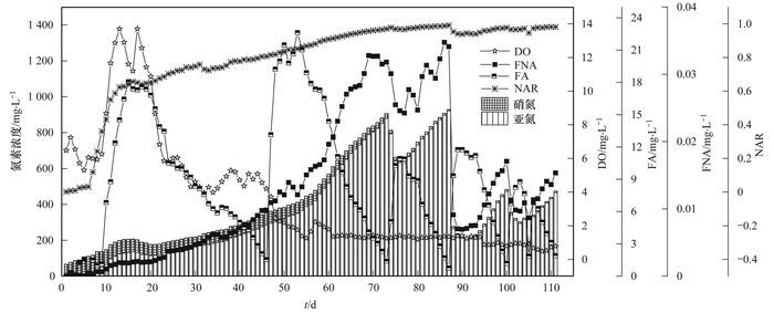各種指標測定方法均按照文獻[21]: NH4+-N:鈉氏試劑分光光度法; (哈希2800, 美國); NO2--N和NO3--N采用離子色譜法(戴安IS-9001, 美國); pH、ORP、DO和T采用WTW在線監測儀(德國).水中FA/FNA濃度按照公式計算[22, 23].