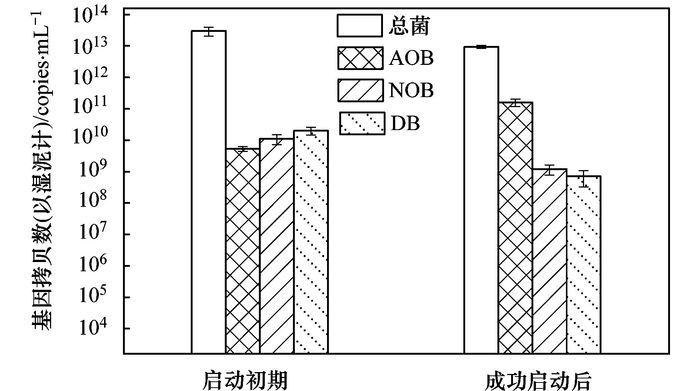 采用定量PCR技術對反應的不同階段所取得的微生物進行定量分析, 主要功能菌包括總菌、AOB、NOB.