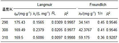 應用上述兩種吸附等溫線對實驗數據進行擬合,所得結果如圖 10和表 2所示.由表 2的擬合參數可知,Langmuir 吸附等溫模型能更好地描述GEC對CR的吸附過程.通過Langmuir吸附等溫方程式擬合可知,GEC在不同溫度條件下對CR的最大吸附容量分別為175.43 mg·g-1(298 K)、169.4 mg·g-1(308 K)和169.50 mg·g-1(318 K).此外,參數RL都符合0<RL <1,因此,CR在GEC上的吸附都屬于優惠吸附;0.1 <1/n <0.5,說明吸附容易進行.