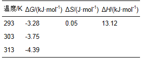對吸附熱力學的研究可以考察吸附過程的吉布斯自由能變化(ΔG)、熵變(ΔS)和焓變(ΔH),進而分析吸附的推動力或者判斷吸附過程是否自發進行等.熱力學參數可以通過式(7)和式(8)求出(Fan et al.,2013).