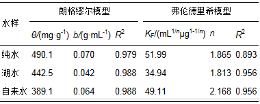 等溫吸附研究在30 ℃下進行,甲基綠初始濃度設置為20、40、60、80、100、120、140 mg·L-1,為考察吸附劑對不同水樣中甲基綠的吸附效果,選擇純水、湖水和自來水作為介質,吸附數據如圖 7a.隨著各水樣中甲基綠濃度的上升,吸附容量在開始時急劇上升,隨后就趨于平緩,說明吸附達到了飽和.采用朗格繆爾和弗倫德里希兩種模型對吸附數據進行擬合,兩種模型線性方程如(1)、(2)所示.
