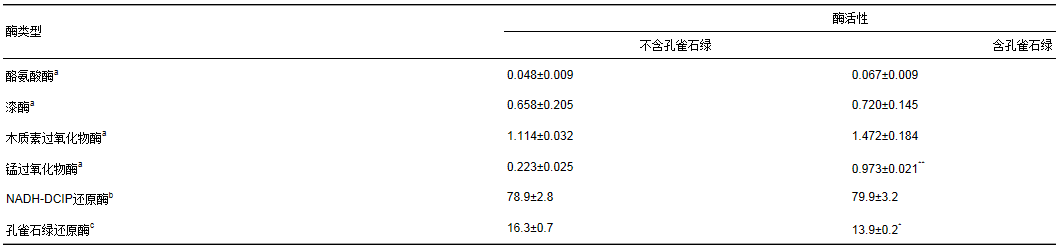 注:a.單位為unit·mg-1·min-1(以protein計); b.單位為μg·mg-1·min-1, 以每分鐘每mg蛋白的DCIP減少量(μg)表示; c.單位為μg·mg-1·min-1, 以每分鐘每mg蛋白的孔雀石綠減少量(μg)表示; 表中數據為平均值±標準差; *p≤0.05, **p≤0.01.