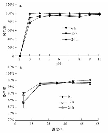 pH值和溫度對孔雀石綠脫色的影響如圖 2所示.當培養時間達到6 h后, 菌株CV-v在pH=3.0~10.0之間對孔雀石綠的脫色率均在80%以上, 而當培養時間達到12 h后, 該菌株對孔雀石綠的脫色率維持在90%以上.隨著培養時間的延長, 當培養時間超過24 h后, 該菌株在pH=3.0~10.0之間可完全脫色孔雀石綠.安賢惠等(2013)的研究中分離了一株Aeromonas屬的菌株, 該菌株對100 mg·L-1孔雀石綠的脫色率達到96.9%需要48 h以上的培養時間;Lv等(2013)的研究發現, 菌株Deinococcus radiodurans R1對孔雀石綠的脫色效果在pH 6.0~8.0之間時最優, 而當pH值低于6.0或高于8.0時, 該菌株對孔雀石綠的脫色率則急劇下降;本課題組以往的研究中分離的菌株Enterobater sp. DH9在pH=3.0~9.0之間時, 也需培養24 h以后, 對孔雀石綠的脫色率才能維持在90%以上.與以往已報道菌株相比, 本研究中的菌株CV-v在pH=3.0~10.0之間對孔雀石綠的12 h脫色率在90%以上, 脫色優勢顯著, 環境適應性強, 具有廣闊的應用前景.
