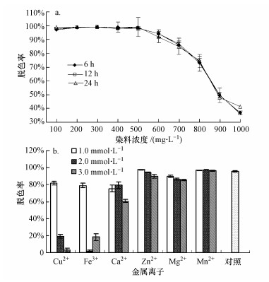 分別調整初始染料濃度為100、200、300、400、500、600、700、800、900和1000 mg·L-1, 接種等量菌株CV-v過夜培養物(菌體干重為0.1~0.2 g·L-1), 并于30 ℃、180 r·min-1條件下振蕩培養, 定時取樣測定.