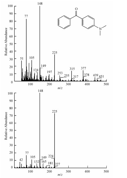 孔雀石綠降解前后的GC-MS分析結果表明, 孔雀石綠降解的主要檢出產物為二甲氨基二苯甲酮(保留時間為14.07 min), 具體如圖 7所示.該產物與GC-MS NIST數據庫中的標準物比對的相似度為70.3%.從二甲氨基二苯甲酮質譜圖上來看, 該產物的特征離子片段主要為:77(82)、105(28)、148(100)和225(36), 與GC-MS NIST數據庫中的標準物基本一致, 可以推斷二甲氨基二苯甲酮為孔雀石綠降解的中間產物之一.