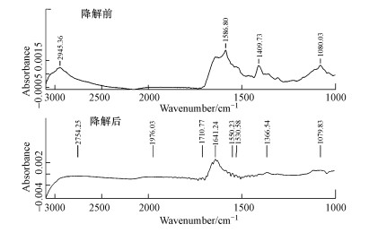 分別收集降解前(未加菌)和降解后(培養24 h后)的混合培養物, 并在10000 r·min-1條件下離心10 min, 取上清, 用Bruker VERTEX 70紅外光譜儀在可清洗的水溶液專用透射池中進行紅外掃描分析, 掃描波長范圍為1000~3000 cm-1, 檢測器系統為DigiTect.