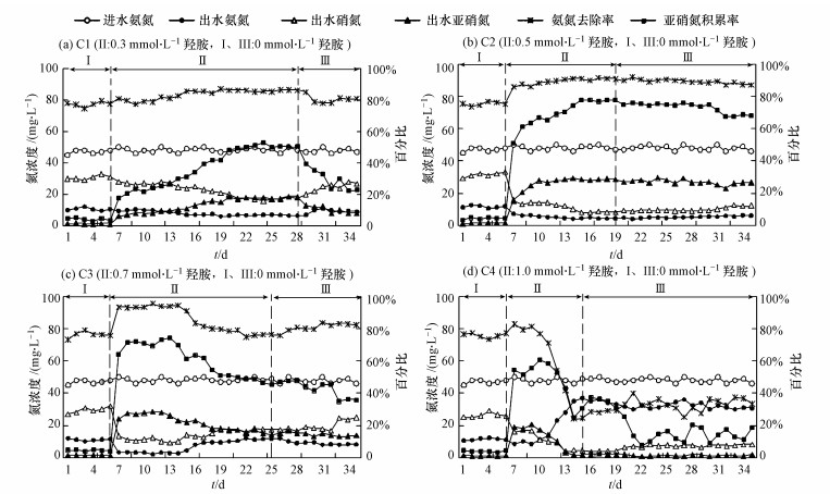 圖 2氨氮去除和亞硝氮積累隨羥胺添加的變化