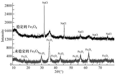 圖 1為Fe3O4納米粒子的XRD圖譜.由圖可知,未穩定和淀粉穩定的Fe3O4納米粒子XRD圖譜都出現了Fe3O4的特征峰,但由于懸浮溶液中存在NaCl,因此,淀粉穩定Fe3O4納米粒子圖譜出現了NaCl的特征峰.除此之外,圖譜并無其他明顯的雜質峰出現,且與Fe3O4標準圖譜相一致,說明無論是穩定還是未穩定的條件下制備得到的都是純度較高的Fe3O4納米粒子(Zhou et al.,2001).穩定Fe3O4納米粒子的衍射峰明顯變寬,表明淀粉作為穩定劑使得Fe3O4納米粒子的粒徑減小(Si et al .,2004).