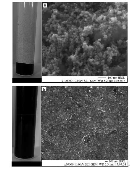 圖 2 Fe3O4納米粒子的SEM圖(a.未穩定Fe3O4,b.穩定Fe3O4)
