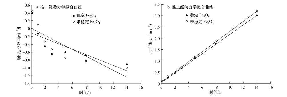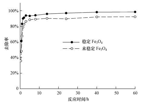 圖 4是Fe3O4納米粒子對As(V)的吸附曲線.由圖可知,無論是未穩定還是穩定的Fe3O4納米粒子,對As(V)的去除率都隨著吸附時間的延長而不斷增加,吸附過程都包含3個階段.初始階段為As(V)的快速吸附過程,在吸附1 h后的去除率就分別達到了70%和80%以上,主要原因是該階段納米粒子的比表面積大,吸附活性點位多,吸附反應容易進行;隨著吸附時間的增加,納米粒子表面的吸附位點逐漸被占據,進入緩慢吸附階段,此時的吸附作用主要依靠內擴散來進行;60 h后吸附就已經達到平衡,未穩定和穩定的Fe3O4粒子此時對As(V)的去除率分別為92%和99%,兩者都表現出高效的除砷能力,與未穩定的Fe3O4納米粒子相比,分散性較好的淀粉穩定的Fe3O4納米粒子除As(V)效率更高.根據He等(2007)的研究,淀粉穩定的納米鐵粒子注入到地下水中進行原位修復,穩定的納米鐵顆粒因為良好的分散性能在注入到地下后具有較強的穿透性,能夠實現與較大面積受污染地下水和土壤的接觸,最終固定到土壤中達到去除污染物的效果.由此可見,采用淀粉作為穩定劑制備Fe3O4納米粒子在進行地下水原位修復方面同樣具有很大的應用潛力,在有效修復的同時,不會破壞土壤原本的結構和功能,符合原位修復的要求和理念(井柳新等,2010).