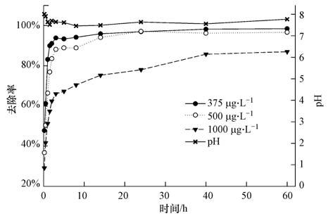 由圖 7可知,隨著溶液中As(V)濃度的增加,去除率逐漸降低.溶液初始As(V)濃度由375 μg·L-1增加到500 μg·L-1時,反應60 h后的去除率由99%下降到97%,增加單位濃度去除率下降的幅度比較小,說明淀粉穩定的Fe3O4納米粒子表面的吸附點位還有大量空余,吸附還未達到完全飽和.當濃度增加到1000 μg·L-1時,去除率下降到了87%,單位濃度的去除率下降速率加快,說明此時溶液中As(V)濃度的繼續增加會使得去除率下降速率加快.穩定的Fe3O4納米粒子吸附溶液中的As(V)過程中,隨著吸附時間的延長,pH會出現小幅度的下降.吸附60 h后溶液pH從初始的8.0變為7.8,60 h內的波動范圍在7.5~8.0,波動幅度較小.因此,用穩定的Fe3O4納米粒子吸附溶液中的As(V)可視為不會引起pH的改變.