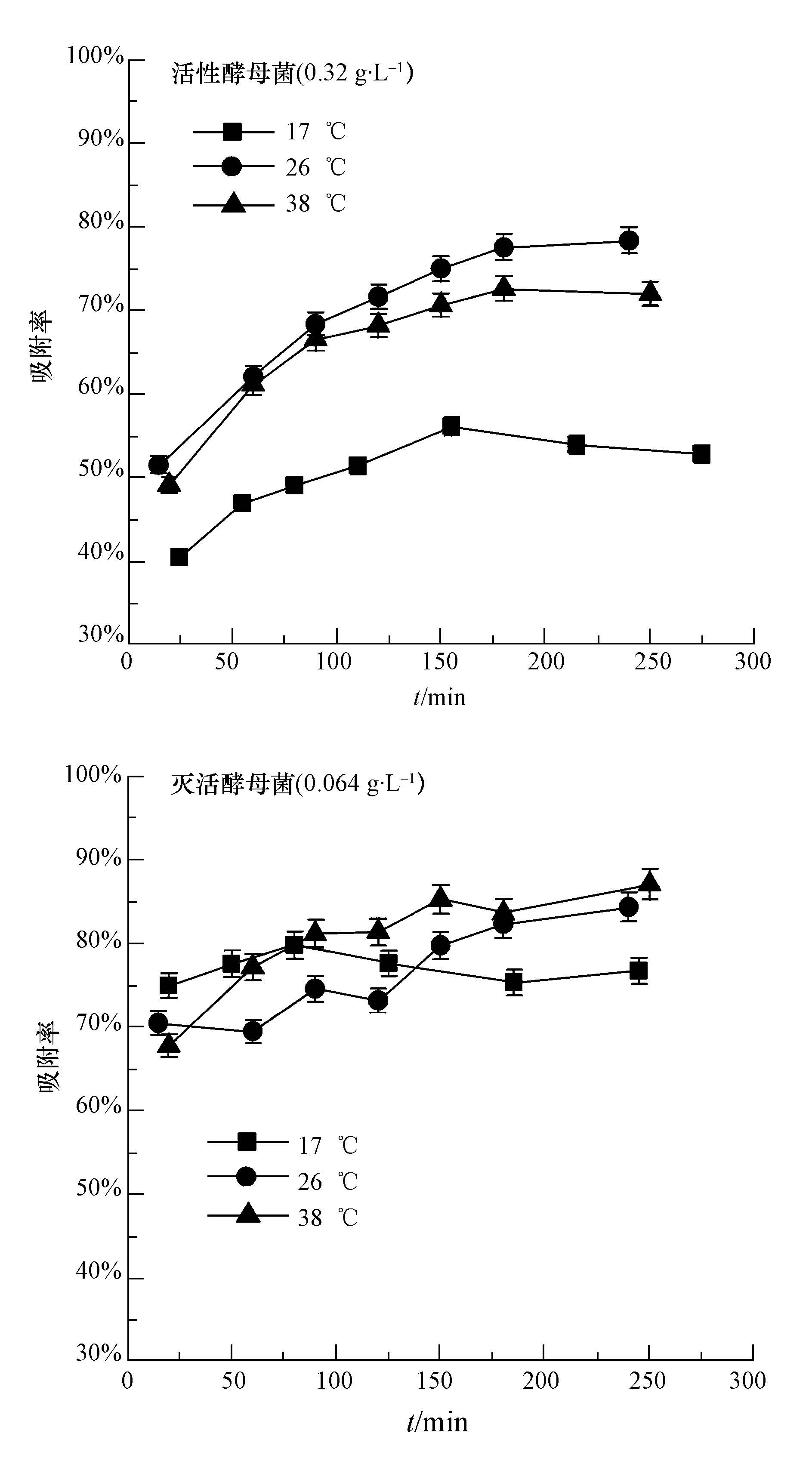 圖 4 溫度對不同活性酵母菌吸附鈾的影響(pH=5.0±0.1,C0=1 mg·L-1)