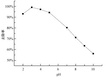 pH是影響去除效果的重要因素之一.在溫度為25 ℃, 投加量為5 g·L-1, 活性紅X-3B濃度為100 mg·L-1時, 調節廢水pH.如圖 4所示, 在酸性條件下, 活性紅X-3B去除率較高, 這是由于殼聚糖中的-NH2被質子化為-NH3+, 使復合改性膨潤土帶正電荷, 與染料分子中磺酸根間具有靜電作用, 有利于吸附.但酸度過高時, 殼聚糖分子會溶解流失, 吸附效果變差.在堿性條件下, 殼聚糖電離受阻, 不能產生靜電作用; 另一方面, 溶液中的OH-與染料分子產生競爭吸附, 不利于染料分子的吸附, 使去除率降低.
