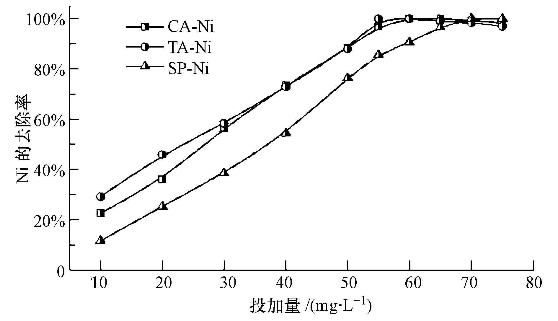 隨著EDTC投加量的增加,Ni的去除效率迅速增加,當投加量與Ni2+達到一定比例時,去除率趨于穩定,繼續增大EDTC投加量,去除率反而有所下降.主要原因是DTC基團電離時帶有負電荷,當EDTC投加量過量時,EDTC與Ni2+螯合形成的細絮體微粒上帶有過剩的負電荷,導致絮體間的靜電斥力加大,影響絮凝效果,去除率有所降低(劉立華等,2012).對于CA-Ni、TA-Ni、SP-Ni,EDTC的最佳投加量分別為60 mg·L-1、55 mg·L-1和70 mg·L-1,對應的Ni去除率分別為99.31%、99.23%和99.51%,殘留濃度均遠小于0.05 mg·L-1,達到《電鍍污染物排放標準(GB21900—2008)》中關于Ni污染物特別排放限值要求( <0.1 mg·L-1).可以看出,EDTC對3種低濃度絡合鎳均能有效脫除,表明EDTC對Ni2+的螯合能力強于TA、CA、SP.