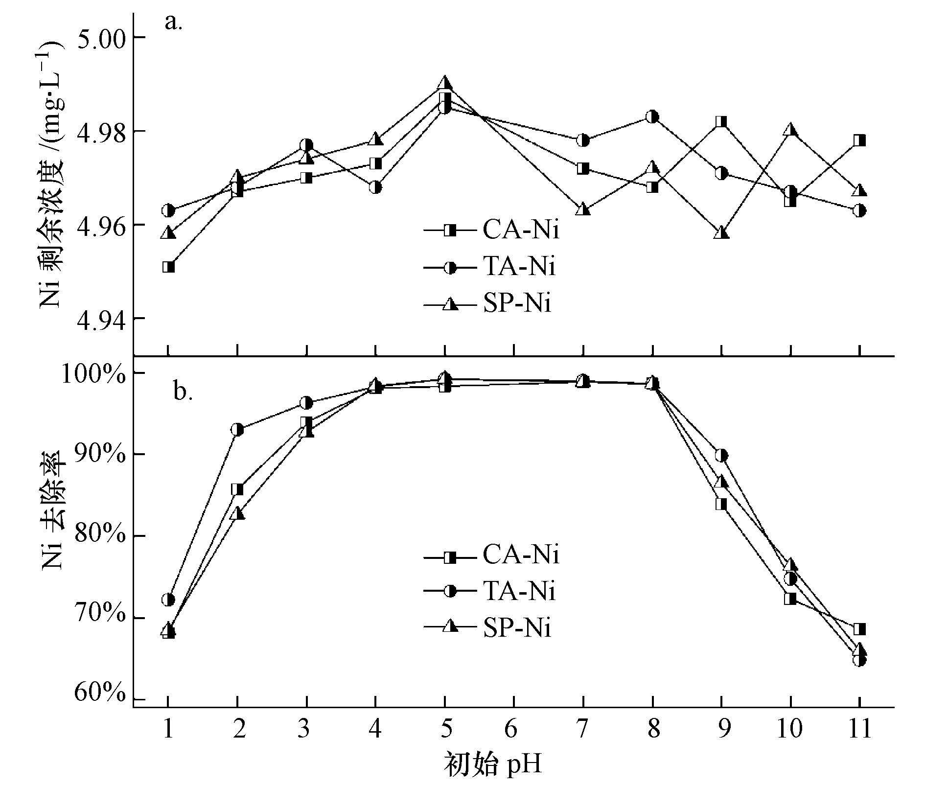 圖 3 廢水初始pH對絡合Ni2+去除的影響(a.MEDTC=0,b.MEDTC為最佳加藥量)