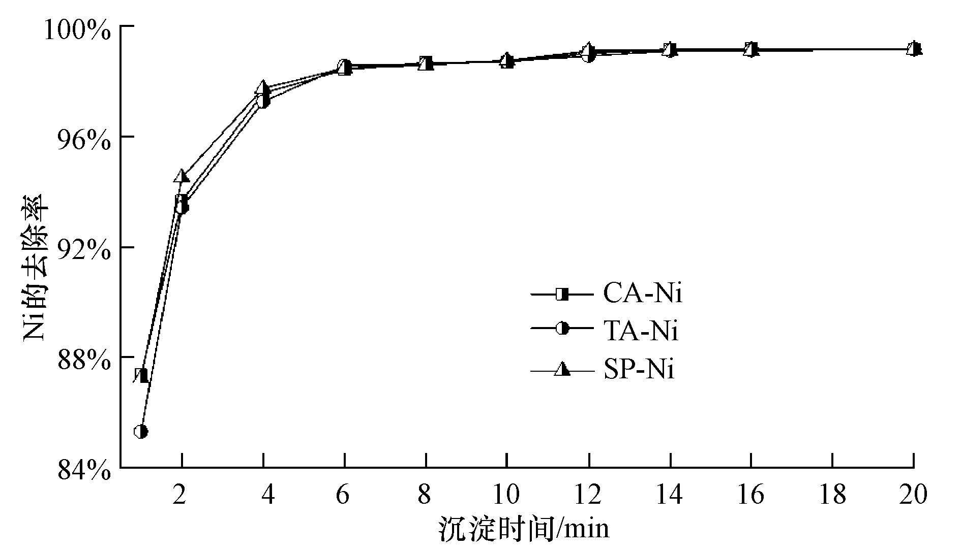 螯合沉淀物的沉降性能較好,EDTC對Ni2+的去除效率隨著沉降時間的延長而增加.當沉淀時間為8 min 時,Ni的去除率可達到98%以上,殘留Ni2+濃度低于0.1 mg·L-1,之后去除率逐漸趨于穩定.與傳統的化學沉淀法相比,其沉降性能大大提高,同時減少了絮凝劑的使用.如硫化物沉淀法處理低濃度重金屬廢水時,生成的沉淀顆粒較小,沉淀周期較長,同時需要添加一定量的混凝劑和絮凝劑(Kelly-Vargas et al.,2012).因此,選用EDTC處理低濃度重金屬廢水,具有沉降周期短,固液易分離、所需設備體積小、效率高等優點.