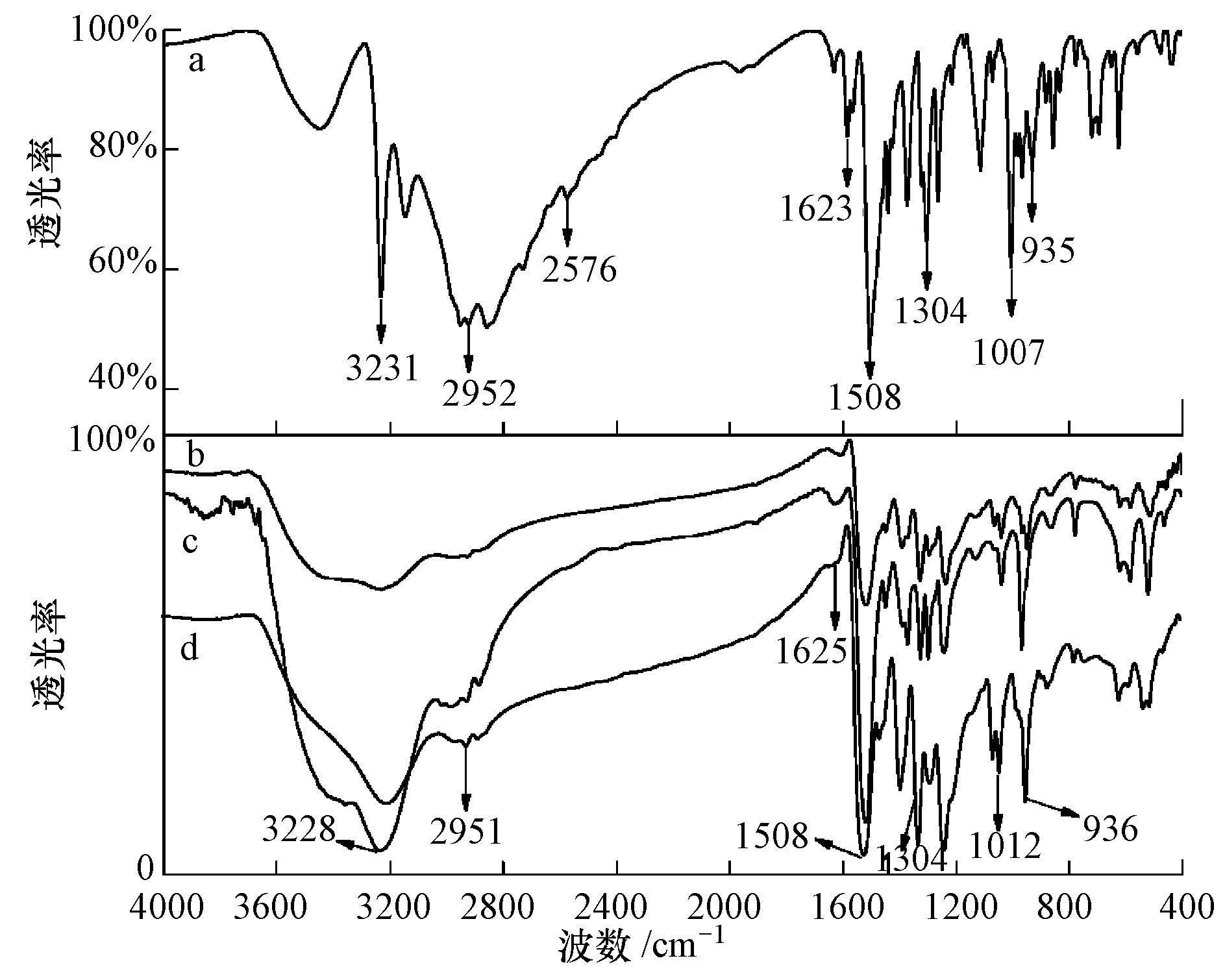 (1) 采用KBr壓片法,Nicolet380傅里葉變換紅外光譜儀(Nicolet380,美國THERMO Fisher Scientific)在波數4000-400 cm-1范圍內測定透光率,儀器分辨率為0.4 cm-1.