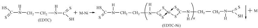 由上述推論可知,EDTC與Ni的作用機理為脫絡-螯合,即反應時,由于EDTC對Ni2+的螯合能力更強,使Ni2+先與CA等絡合劑分離,后EDTC與Ni2+生成更穩定的螯合沉淀物EDTC-Ni,進而可以深度脫除低濃度絡合Ni,其本質是由于EDTC分子為左右對稱結構,含有二硫代羧基基團—CSSH,二硫代羧基基團上的S原子半徑較大,電負性強,具有3對孤立的電子對,其中2對可以占用鎳離子的空d軌道,形成配位鍵.根據配位場理論,在d軌道全空的情況下,容易形成正四面體型的結構,這樣各電子對之間的相互排斥力小,而S原子外層 4對電子也形成互斥力小的正四面體構型,形成穩定的交聯網狀螯合物(Zhen et al.,2012),其反應方程式如式(3)所示.此外,EDTC分子中N-C鍵有很強的電負性,通過電子傳遞作用,使得二硫代羧基上的S原子電負性增強,促進S原子更易失去電子而極化變形形成電場,從而與廢水中Ni2+趨向形成強穩定的疏水性螯合沉淀物(嚴蘋方等,2015;李清峰等,2014).由于螯合產物中不含有CA等絡合劑,使得三螯合沉淀物的紅外圖譜基本一致,如圖 6b、c、d所示,三者的出峰強度的差異體現了EDTC與3種絡合Ni反應的差異:3種絡合劑結構不同,對Ni2+的螯合能力大小不同,當EDTC對絡合Ni脫絡時,所需能量不同,引起鍵能發生變化,導致了3種螯合沉淀物紅外圖譜的差異.其中,M代表 3種絡合劑(CA、TA、SP).