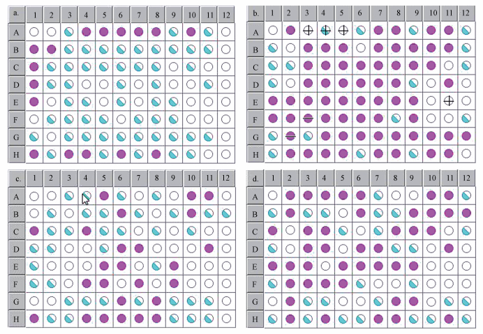 圖 3 AG-56(a.24 h, b.120 h)與對比菌株(c.24 h, d.120 h) C源、敏感因子代謝圖(黑色實心圓表示對該因子/碳源非常敏感/可利用-陽性;灰白色半圓表示對該因子/碳源較為遲鈍/可利用性差-半陽性;白色圓圈表示對該因子/碳源非常遲鈍/不可利用-陰性)