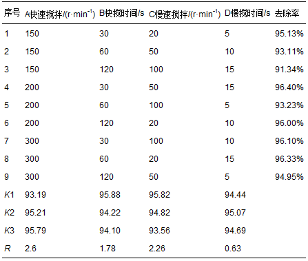 從表 4可知,通過改變不同的水力條件,其除磷的效果是不同的,最高的除磷效率可以達到96.40%,最低的也有91.34%,從總體而言,除磷效率較高.通過對極值R的分析我們可以看出,四種因素影響大小為:A>C>B>D,因此混凝劑最佳的水力條件確定為:快速攪拌的轉速為300 r·min-1,時間為30 s;而慢速攪拌的轉速為20 r·min-1,時間為10 min.