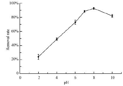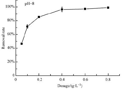 采用模擬含磷廢水(TP濃度為2 mg·L-1)進行實驗,圖 1為在同一投加量(0.50 g·L-1)下pH對混凝劑除磷效果的影響,圖 2為在同一pH(pH=8)下投加量對混凝劑除磷效果的影響.
