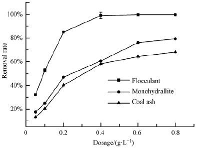 為驗證混凝劑的除磷效果,實驗對不同投加量下混凝劑對實際污水的處理效果進行了研究,并對比研究了相同制備條件不同投加量下粉煤灰和鋁土礦對總磷的去除效果,實驗結果見圖 3和圖 4.