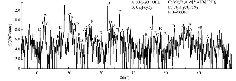 由圖 5并結合混凝劑的X射線熒光光譜分析可知,混凝劑主要由高嶺石(Al2Si2O5(OH)4)、黑鈣鐵礦(Ca2Fe2O5)、鎂綠泥石((Mg,Fe,Al)-x[siAlO5](OH)4)、氫氧化鐵(FeO(OH))以及含有氯及鐵的物質(Cl5H11Cl2FeN3)構成.可以看出,混凝劑中含有羥基鐵(鋁)及高分子的氯化鐵鋁等物質,因此,該混凝劑是一種無機高分子復合混凝劑.