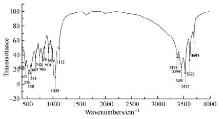 由圖 6 可以看出,在3376 cm-1、3527 cm-1、3620 cm-1處有吸收峰,說明存在O—H基團(Workman,2012);在3394 cm-1、3451 cm-1處有吸收峰,說明存在O—H或N—H基團,本研究中所用原料不含N,因此此處為O—H基團;在558 cm-1、581 cm-1處有吸收峰,說明存在C—Br、C—Cl、C—I基團,結合本實驗所用材料,此處為C—Cl基團.結合XRD分析結果,混凝劑樣品中存在Si—O—Si、Fe—OH、Al—OH、H—OH、C—Cl等基團,混凝當混凝劑加入到水中后,形成Fe3(OH)27+、Aln(OH)m(3n-m)+等多羥基絡合離子,其羥基是不飽和的,這些絡合物從溶液中吸取羥基來補充其未飽和位,對水中聚磷酸鹽等膠體顆粒形成強烈吸附,從而發生混凝.