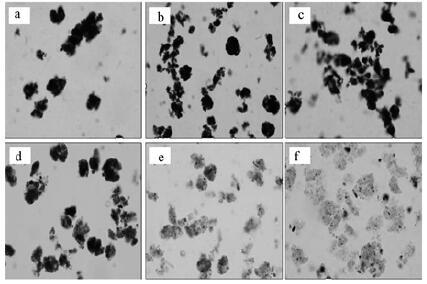 圖 9 不同投加量下的混凝體的照片(×200; a、b、c、d、e、f分別表示投加量為0.05、0.10、0.20、0.40、0.60、0.80 g·L-1)