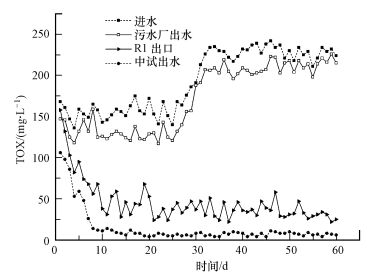 TOX為聚甲醛廢水中濃度僅次于甲醛的有毒污染物, 且較甲醛更難生化降解.為考察復合菌劑對TOX降解能力, 中試系統采用污水廠同期進水, 對中試系統一級好氧反應器 (R1) 出口、二沉池 (R4) 出水和同期污水廠出水的TOX濃度進行了測定, 結果如圖 3所示.