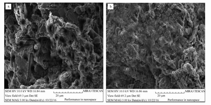 圖 6 強化前后污泥掃描電鏡圖 (放大倍數3000x)(a.同期聚甲醛污水廠活性污泥, b.中試系統第40 d活性污泥)