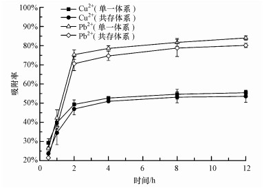 圖 1 處理時(shí)間對(duì)P. aeruginosa吸附Cu2+、Pb2+的影響