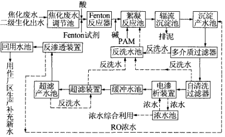 焦化廢水,二級生化出水深度處理系統(tǒng)的外排濃水經(jīng)混合后自流進入焦化廢水調(diào)節(jié)池調(diào)節(jié)水量及水質(zhì)后經(jīng)泵 加壓提 升進入 Fenton 反應(yīng)器加酸控制 Fenton 反應(yīng)器的進水pH 并投加 Fenton 試劑,其出水進入絮凝反應(yīng)池。加堿調(diào)節(jié)使 絮凝反應(yīng)池進水呈中性。同時投加PA M 強化絮凝 .出水進入輻、流沉、淀池。沉淀池出水進人沉淀產(chǎn)水池。再次加壓提升后 依次通過多介質(zhì)過濾器及自清洗過濾器進行預(yù)過濾,出水進入電滲析裝 置進行初次脫鹽。其出水進入緩沖水池,電滲析裝置的濃水排入濃水池供內(nèi)循環(huán)利用,多余濃水排出系統(tǒng)進行綜合利用。緩沖水池的出水經(jīng)泵提升后進人超濾裝置。出水進入超濾產(chǎn)水池。超濾產(chǎn)水池出水經(jīng)泵提升通過保安過 濾器后進入反滲透裝置進行再次脫鹽,出水進入回用水池,作為廠區(qū)生產(chǎn)補充新水使用。反滲透裝置濃水回流至沉淀產(chǎn)水池進行再次循環(huán)脫鹽。