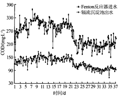 從圖2可知Fenton 反應(yīng)器進水的 CO D 在179.9~367.2 m g/L 范圍內(nèi),變化幅度較大,而輻流沉淀池出水的 CO D 平均為107.1 m g/L 。且穩(wěn)定保持在158 m g/L 以下 .該部分工藝對 C O D 的平均去除率為60.8%,去除效果顯著,但其出水仍含有部分難降解的污染物,易造成濾膜及反滲透膜的污堵,需要進一步處理。