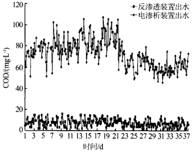 多介質(zhì)過濾器及自清洗過濾器作為電滲析裝置的預(yù)處理設(shè)備,可以去除廢水中的懸浮物 、顆粒和膠體 .降低廢水的濁度和 SD I.使其滿足 電滲析裝置的進水要求。電滲析裝置 利用直流電場及離子交換膜實 現(xiàn)廢水的初次脫鹽該工程采用的立式 多介質(zhì)過濾器設(shè)計出力為80m 3/(h ·套 ),直徑為 5.0 m ,共4臺 ,回收率 ≥9O% ;自清洗過濾器的設(shè)計出力為 200 m T(h·套 )。過濾精度為100 D m ;電滲析裝置的處理能力為20 m f f(h .套 ),回收率為65%~75%,脫鹽 率 為 60%~70% ,共 22 臺 。廢水經(jīng)多介質(zhì)過濾器 、自清洗過濾器 、電滲析裝置處理后對COD、電導(dǎo)率 的去除效果如圖3、圖4 所示。