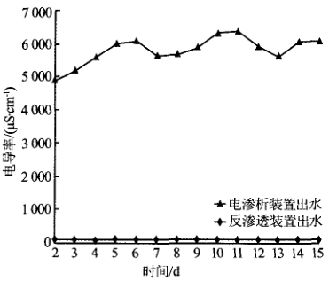 從圖4可知,該工藝的調(diào)節(jié)池出水、輻流沉淀池出水、電滲析裝置出水的電導(dǎo)率分別在 5 672~6 573 、7 090~9 002 、2 127 ~3 600 S/cm 范圍內(nèi)。 由于在Fenton 反應(yīng)器進水投加硫酸、絮凝反應(yīng)池 進水 投 加N aOH .導(dǎo)致輻流沉淀池 出水平均電導(dǎo)率較調(diào)節(jié)池出水高 31.4%.但經(jīng)過初次脫鹽后。電滲析裝置出水平均電導(dǎo)率較調(diào)節(jié)池出水低 53.2%.脫鹽效果顯著.緩解了后續(xù)反滲透膜的脫鹽壓力。