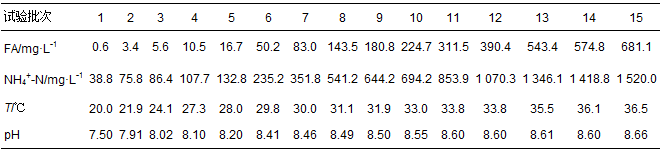 本文通過批次試驗, 采用SBR反應(yīng)器, 以短程硝化污泥為研究對象, 通過設(shè)定不同初始NH4+-N濃度, pH值和溫度, 以獲得不同F(xiàn)A濃度梯度, 運行條件見表 2, 基于考察SBR系統(tǒng)活性污泥的硝化性能、總氮損失的基礎(chǔ)上, 研究FA濃度對氨逃逸的影響, 最終建立FA和氨逃逸速率的相關(guān)規(guī)律.需要說明的是:為減少試驗誤差, 即每一FA濃度下進行3次平行試驗, 試驗數(shù)據(jù)取3組平行試驗平均.