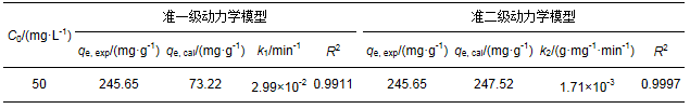 式中,qe和qt分別為吸附平衡時及t時刻吸附劑上的吸附容量(mg·g-1);k1和k2分別為準一級動力學(min-1)和準二級動力學常數(g·mg-1·min-1);t 為吸附時間(min).