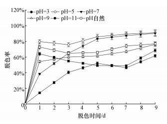pH對菌株CB1脫色直接大紅的影響:在100 mL三角瓶中加入染料發酵液,分別調整液體培養基的pH為3、5、7、9、11,經121 ℃滅菌后,向三角瓶中接入直徑8 mm新活化的菌絲塊3片,于28 ℃暗培養9 d,以pH自然,含有等量染料的發酵液作為對照,分別在第1~9 d測量吸光值,計算對應處理的染料脫色率.