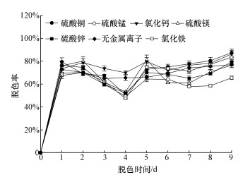 金屬離子對菌株CB1脫色直接大紅的影響:在100 mL三角瓶中加入40 mL染料發酵液,分別向三角瓶中加入1 mmol·L-1的CuSO4、MnSO4、CaCl2、MgSO4、ZnSO4、FeCl3,經121 ℃滅菌后,向三角瓶中接入直徑8 mm新活化的菌絲塊3片,于28 ℃暗培養9 d;以染料發酵液接入直徑8 mm新活化的菌絲塊3片作為對照,分別在第1~9 d測量吸光值,計算對應的染料脫色率.